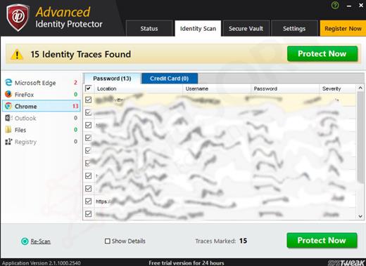 Using Advanced Identity Protector is extremely simple. Once this identity protection software gets installed, launch, and click Start Scan Now to identify any hidden privacy exposing identity traces. These traces contain sensitive information such as email ids, login ids, passwords, credit card numbers, contact information and social security number etc. Once Advanced Identity Protector detects these traces, you can either delete or can save them in the in-built Secure Vault.