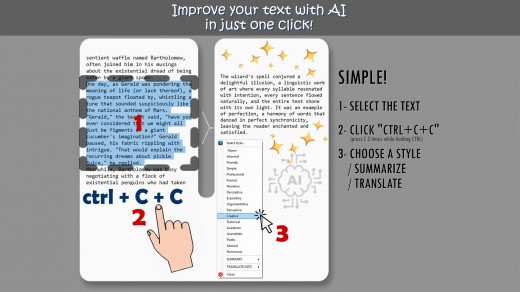 Description: Improve your text with AI in just one click! Correct any errors, improve clarity and flow… change the style! Generate summaries and translate texts in 25+ different languages! Revolutionize your writing in an instant! Revolutionize your writing in an instant!