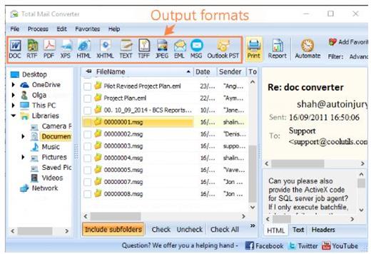 Total Mail Converter Pro Crack Download converts MSG and EML to PDF, DOC, TXT, HTML, HTMLX, TIFF, RTF documents and images (TIFF, JPEG). While other email converters only extract and save attached files in their original formats, the Pro version is unique – it converts attachments as well. For example, if you have an email with a doc attachment, Coolutils Total Mail Converter can convert both the message and the attachment to PDF as part of a single operation.