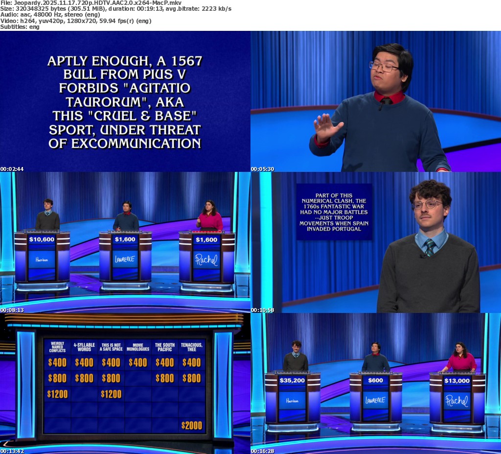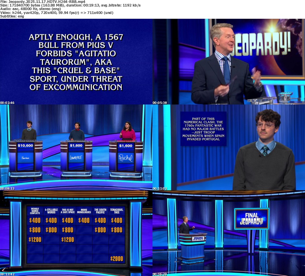 Feel free to post your Old Jeopardy 2025.11.17 720p HDTV x264-MacP torrent, subtitles, samples, free download, quality, NFO, direct link, free link, uploaded.to, rapidgator, turbobit, openload, mega.co.nz, filefactory, crack, serial, keygen, requirements or whatever-related comments here. Don't be rude (permban), use only English, don't go offtopic and read FAQ before asking a question. Owners of this website aren't responsible for content of comments.
