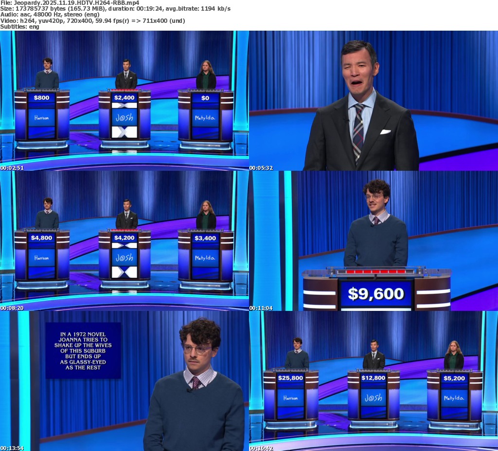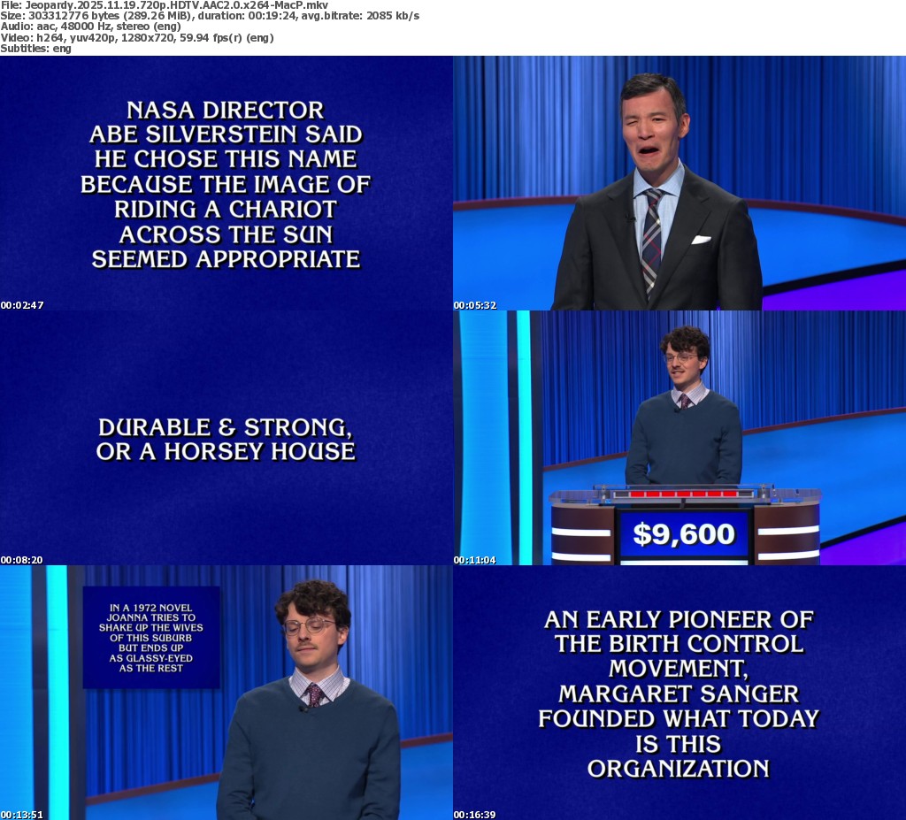 Feel free to post your Old Jeopardy 2025.11.19 720p HDTV x264-MacP torrent, subtitles, samples, free download, quality, NFO, direct link, free link, uploaded.to, rapidgator, turbobit, openload, mega.co.nz, filefactory, crack, serial, keygen, requirements or whatever-related comments here. Don't be rude (permban), use only English, don't go offtopic and read FAQ before asking a question. Owners of this website aren't responsible for content of comments.
