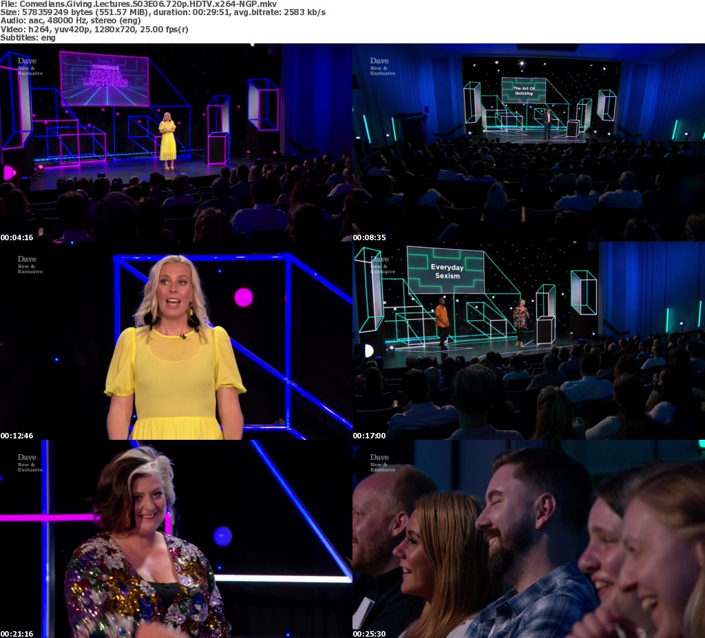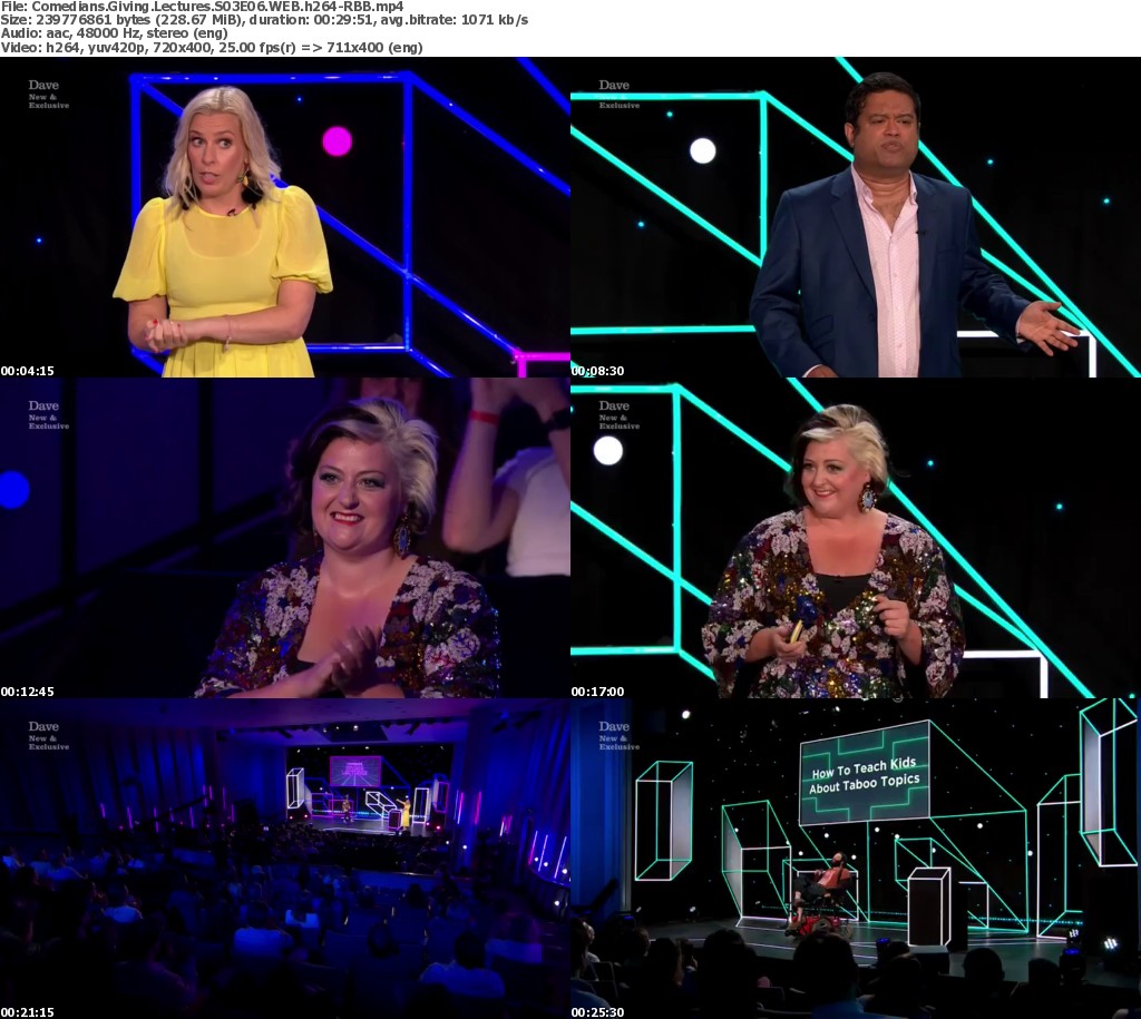 Sara Pascoe is joined by comedians Paul Sinha, Kiri Pritchard-McLean and Tim Renkow, who compete to deliver the best lecture. Paul’s lecture is ‘The Art Of Quizzing’, Kiri’s is ‘Everyday Sexism’ and Tim’s is ‘How To Teach Kids About Taboo Topics’.